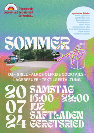 Wir veranstalten am Samstag, den 20.07.24 eine Sommerparty auf dem Basketballplatz am Jugendzentrum Saftladen in Geretsried. Freut euch auf eine chillige Atmosphäre mit elektronischer Live-Musik, leckerem Grill und alkoholfreien Cocktails! Dazu könnt Ihr eure eigenen Saftladen-Bags gestalten! Lasst euch überraschen. Abschließen tun wir das Ganze mit einem Lagerfeuer und Stockbrot. Um 16:00 Uhr geht’s los, wenn’s regnet sind wir drinnen!