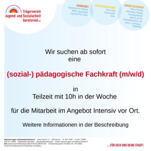 Wir suchen zum nächstmöglichen Zeitpunkt eine sozialpädagogische Fachkraft mit zehn Wochenstunden bei unserem Angebot "Intensiv vor Ort".