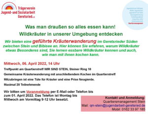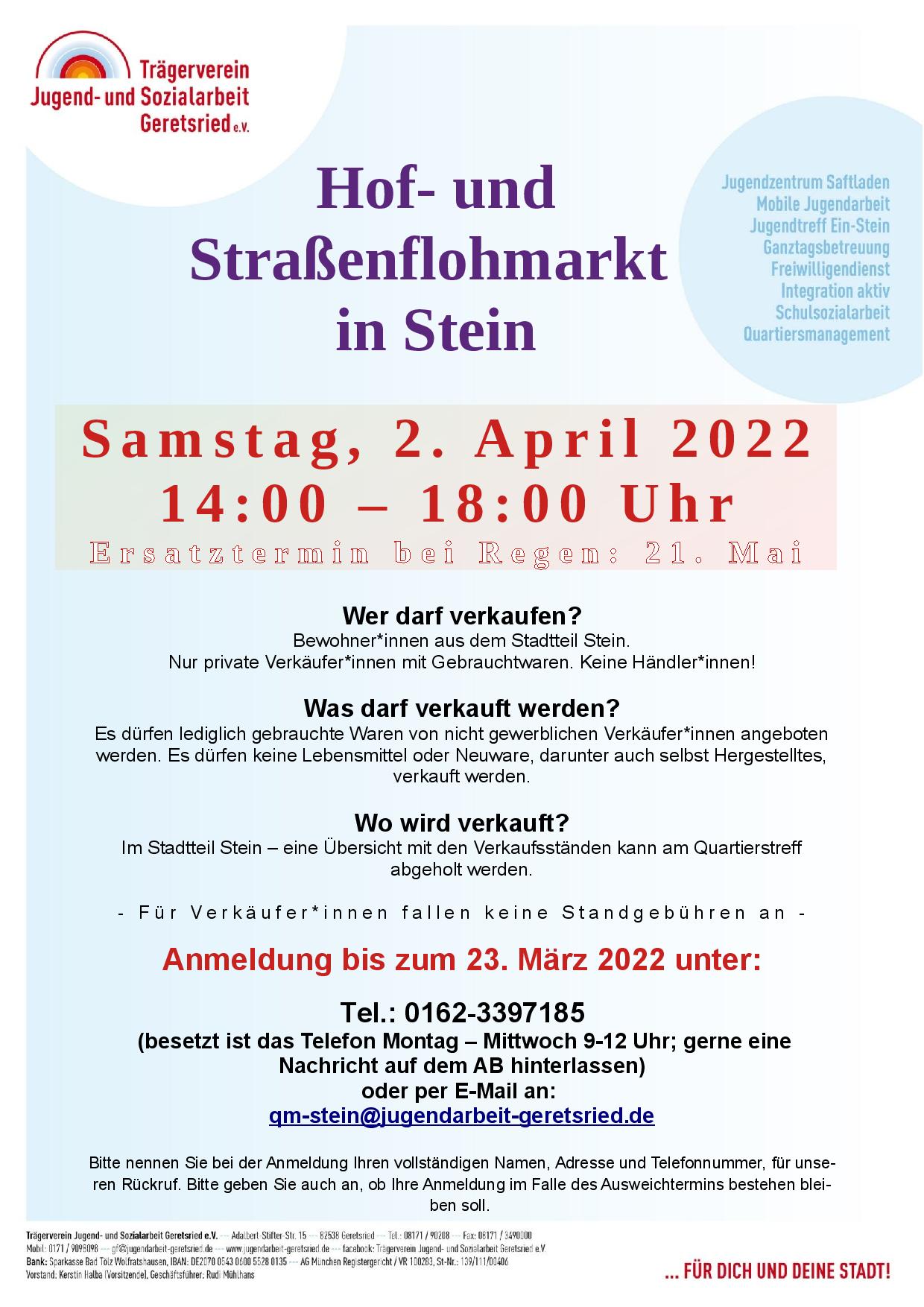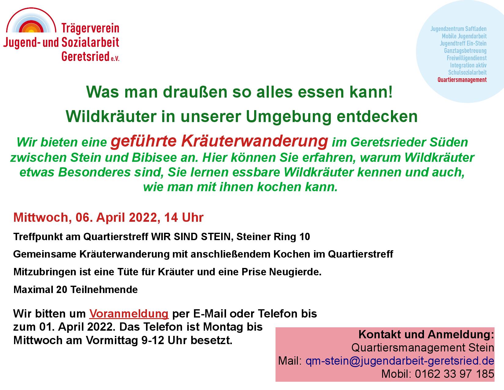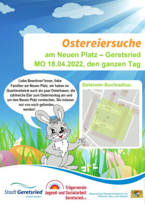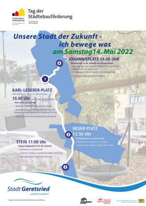 „Wir im Quartier“, ganz nach diesem Motto wird der diesjährigen Tag der Städtebauförderung am Samstag, den 14. Mai 2022 gefeiert. Auch Geretsried nimmt natürlich teil und so lädt der Trägerverein Jugend- und Sozialarbeit Geretsried e.V. Hand in Hand mit der Stadt Geretsried zu einem bunten Programm ein: Die gemeinsame Radtour, zu der alle Bürger*innen eingeladen sind, startet um 10.00 Uhr am Karl-Lederer-Platz. Von dort aus geht es nach Stein, dann an den Neuen Platz und schließlich an den Johannisplatz.