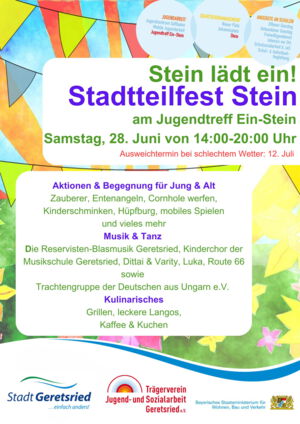 Bei hochsommerlichen Temperaturen fanden sich am Samstag, den 28.Juni zahlreiche Besucherinnen und Besucher auf dem Freigelände des Jugendtreffs Ein-Stein ein. Für Jung und Alt war ein abwechslungsreiches Programm geboten, das keine Wünsche offen ließ. Musikalisch sorgten die Blasmusik der Reservisten, eine Musikgruppe der Musikschule Geretsried, Solokünstler Luka sowie die Band „Route 66“ für beste Unterhaltung. Auch tänzerisch wurde einiges geboten: Die Deutschen aus Ungarn präsentierten eine eindrucksvolle Tanzvorführung.