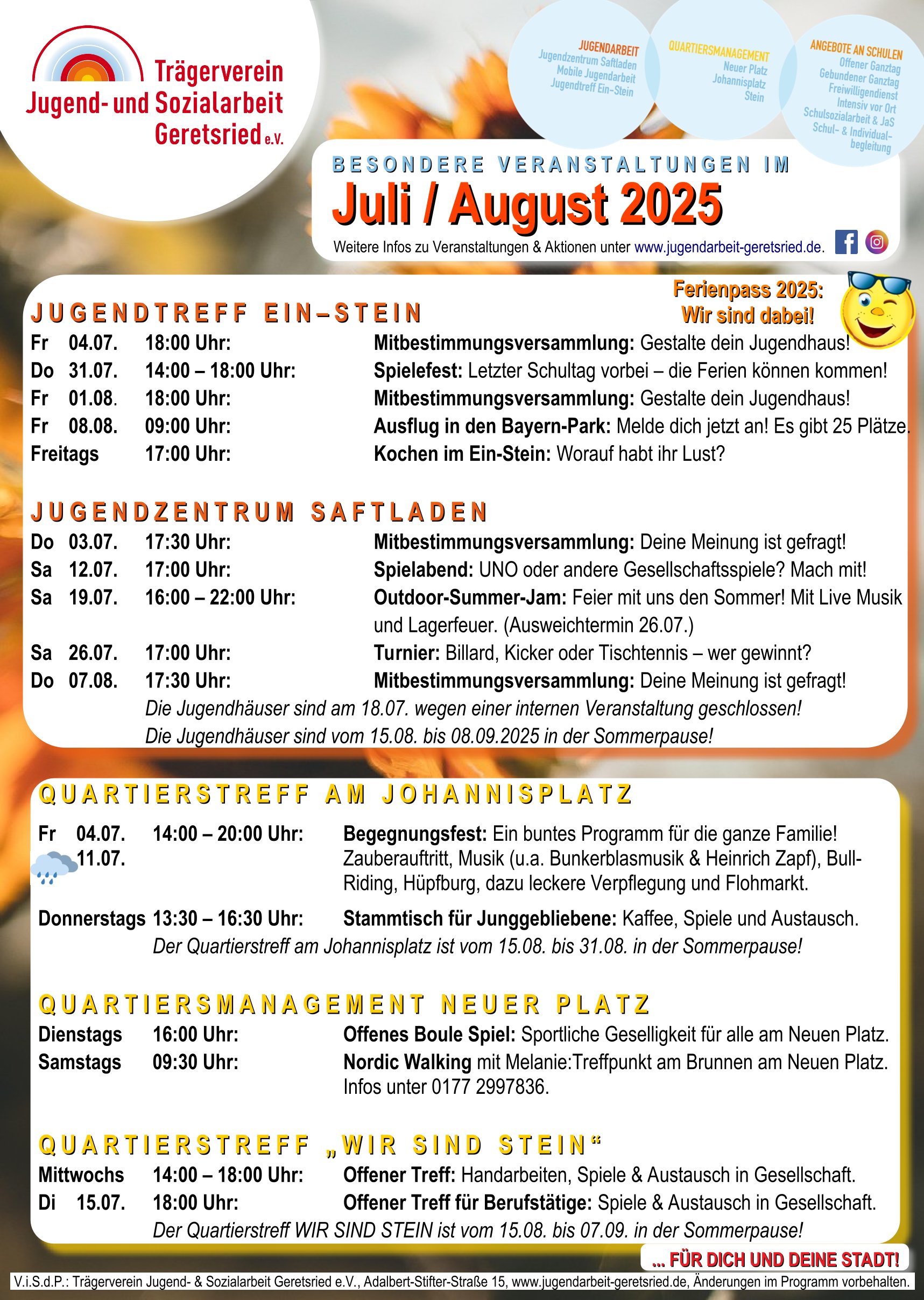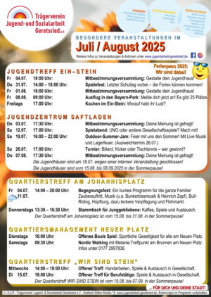 Habt ihr schon einen Blick in unser Monatsprogramm geworfen? Letzte Woche liefen zum Monatsanfang die Mitbestimmungsversammlungen in unseren Jugendhäusern und am Johannisplatz kamen viele Menschen zum Begegnungsfest zusammen. Aber es wartet noch mehr auf euch!