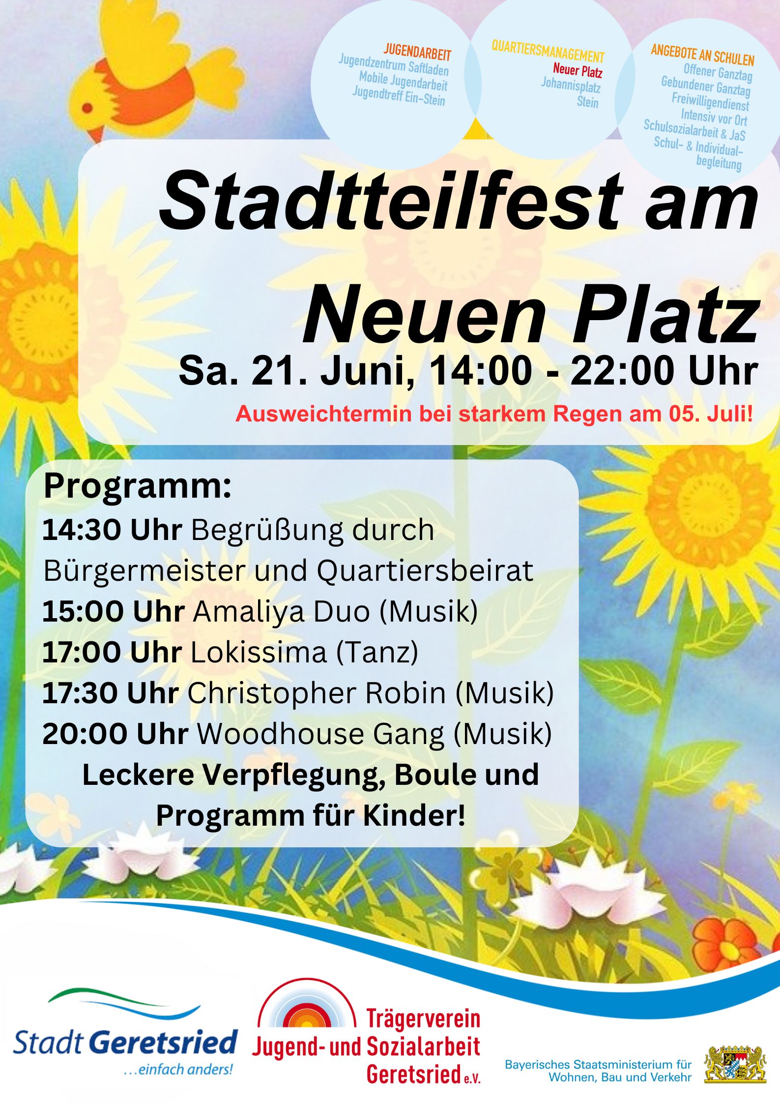 Bei strahlendem Sonnenschein feierten am 21. Juni 2025 zahlreiche Besucherinnen und Besucher das Stadtteilfest am Neuen Platz. Eröffnet wurde das Fest von der 2. Bürgermeisterin Sonja Frank, die die Bedeutung von Gemeinschaft und Zusammenhalt betonte.