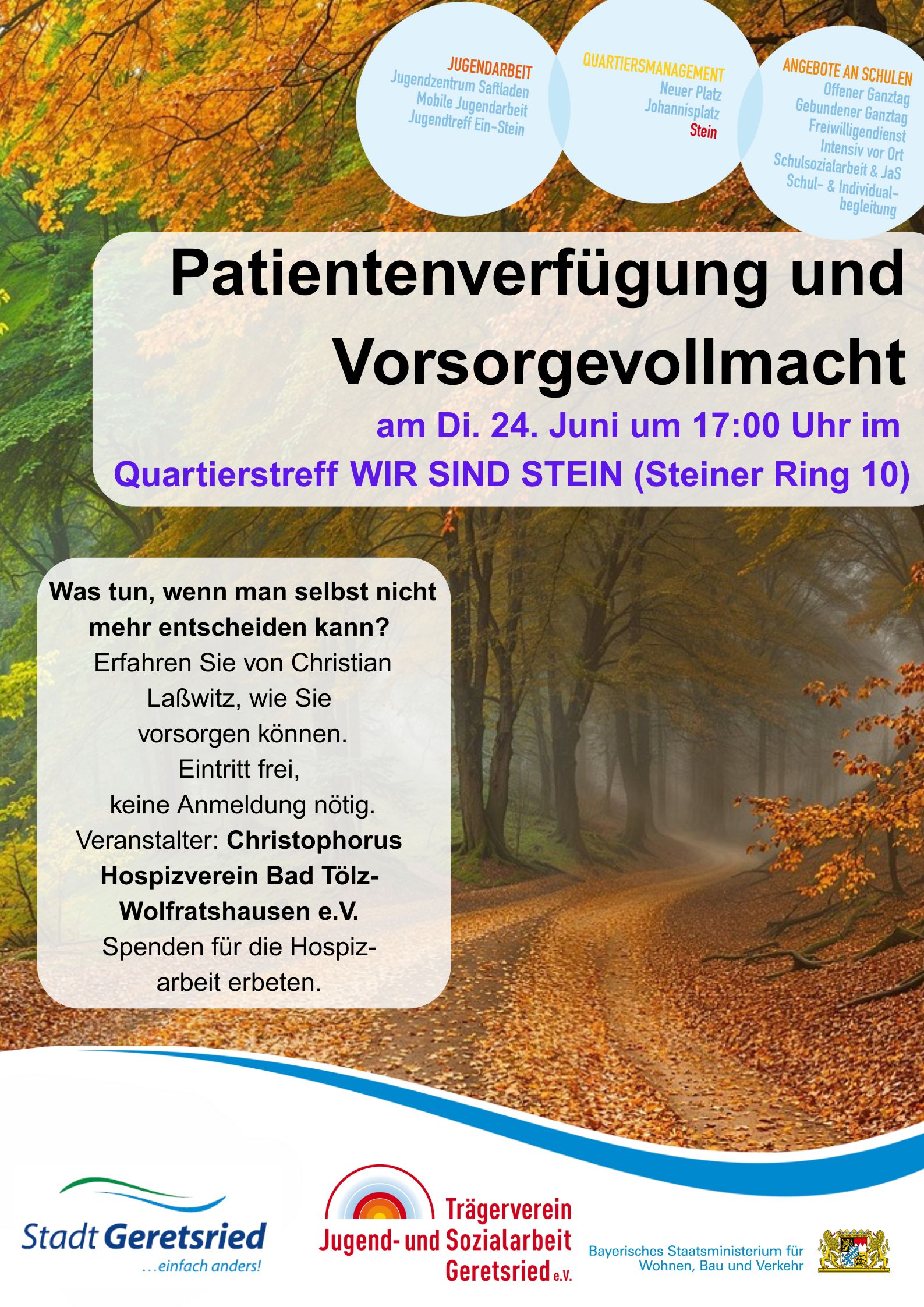 Am Dienstag, den 24. Juni 2025, um 17:00 Uhr lädt der Quartierstreff WIR SIND STEIN zu einem Vortrag über das Thema Patientenverfügung und Vorsorgevollmacht ein. Referent ist Herr Christian Laßwitz vom Christophorus Hospizverein Bad Tölz-Wolfratshausen e.V.