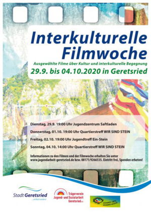 Der Trägerverein Jugend- und Sozialarbeit Geretsried e.V. veranstaltet auch in diesem Jahr wieder eine Interkulturelle Filmwoche. Diese findet vom 29.09. bis 04.10.2020 an ausgewählten Tagen und Orten statt, die Sie dem Text weiter unten entnehmen können. Wir freuen uns auf zahlreiche Besucherinnen und Besucher, die mit uns ausgewählte Filme über Kultur und interkulturelle Begegnung genießen und mit uns hierüber in Austausch gehen. Lassen Sie sich von unserem Programm überraschen!