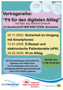 Digitale Medien und Anwendungen begleiten uns täglich – im Beruf, in der Freizeit und selbst im Gesundheitswesen. Doch oft ist es gar nicht so einfach, den Überblick zu behalten und sicher mit den neuen Technologien umzugehen. Die Vortragsreihe „Fit für den digitalen Alltag“ mit Herrn Roland Umlauft bietet leicht verständliche Informationen und praktische Tipps, um digitale Themen besser zu verstehen und souverän im Alltag anzuwenden.
