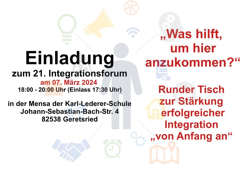 Das Team von Integration Aktiv Geretsried lädt am 07. März 2024 zum 21. Integrationsforum mit Austausch ein. Beginn ist um 18:00 Uhr in der Mensa der Karl-Lederer-Schule.