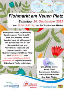 Der beliebte Flohmarkt am Neuen Platz, liebevoll organisiert vom Quartiersbeirat und Quartiersmanagement, geht am 20. September in die nächste Runde! Alle Geretsriederinnen und Geretsrieder sind herzlich eingeladen, selbst zu verkaufen. Anmeldungen ab sofort gern unter qm-neuerplatz@jugendarbeit-geretsried.de oder 0174-3033211. Eigene Tische bitte mitbringen, die Teilnahme ist kostenlos. Uhrzeit: 12:00–16:00 Uhr.