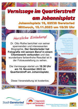 Die Vernissage startet um 18:30 Uhr am 15. November 2023 im Quartierstreff am Johannisplatz in Geretsried.
