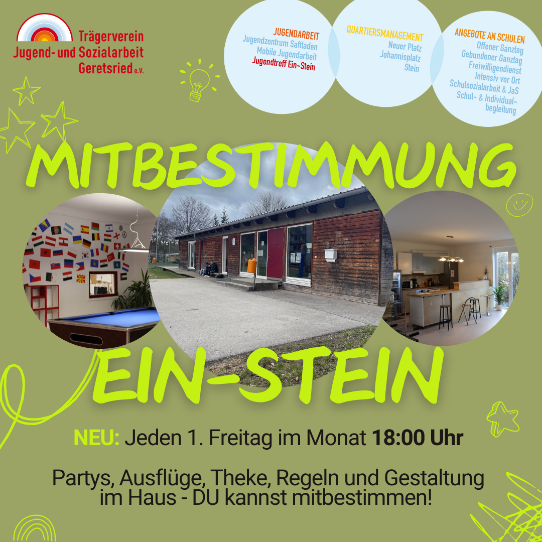 Jedes Jugendhaus hat einmal im Monat einen Mitbestimmungsversammlung, zu der alle Kinder und Jugendlichen eingeladen sind. Wir reden über Dinge, die wichtig sind fürs Ein-Stein und für die Besuchenden. Ganz egal ob Ausflüge, Anschaffungen, Parties oder Hausregeln, hier kann drüber gesprochen werden. Komm einfach vorbei und mach mit!