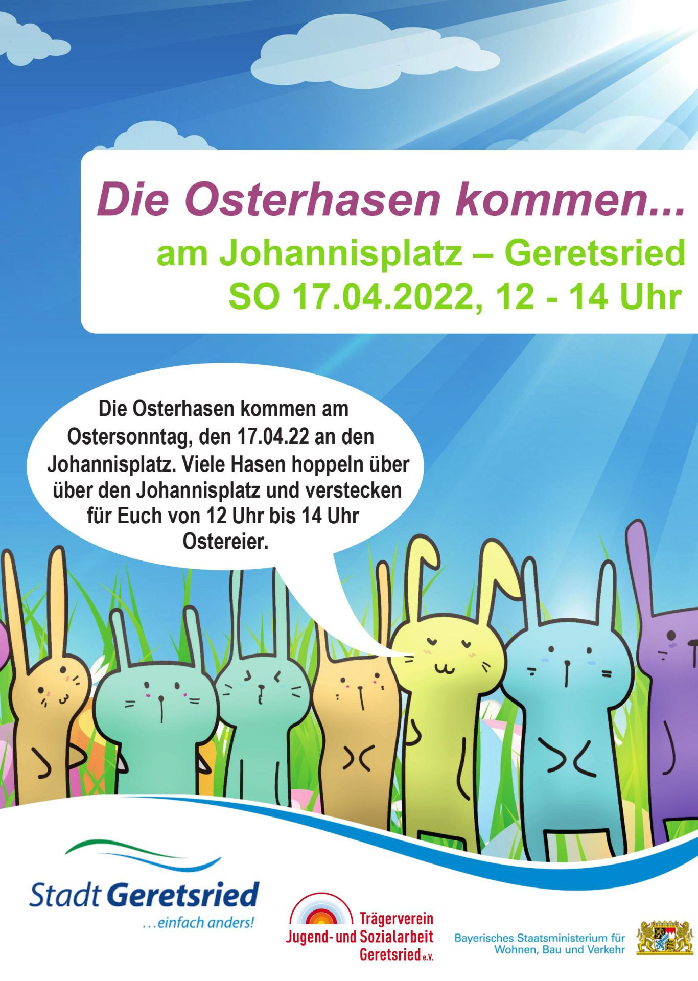 Am Ostersonntag, den 17.04.2022 von 12 bis 14 Uhr hoppeln ein paar Osterhasen über den Johannisplatz und verstecken gemeinsam Ostereier. Das Quartiersmanagement Johannisplatz lädt Kinder und Familien vom Johannisplatz herzlich ein, an der Aktion teilzunehmen und fleißig mit zu suchen!