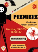 Die Premiere zum Musikvideo "Break the Chain", mit der Musik und Choreographie von One Billion Rising, findet am Dienstag, den 14.02.23 um 17:30 Uhr im Tölzer Jugendcafé statt! Auch Geretsrieder Mädchen und Frauen sind dabei und werden auf großer Leinwand gezeigt. Anschließend findet noch eine After-Show-Party statt! Auch Jungs sind für solidarischen Beistand herzlich eingeladen!