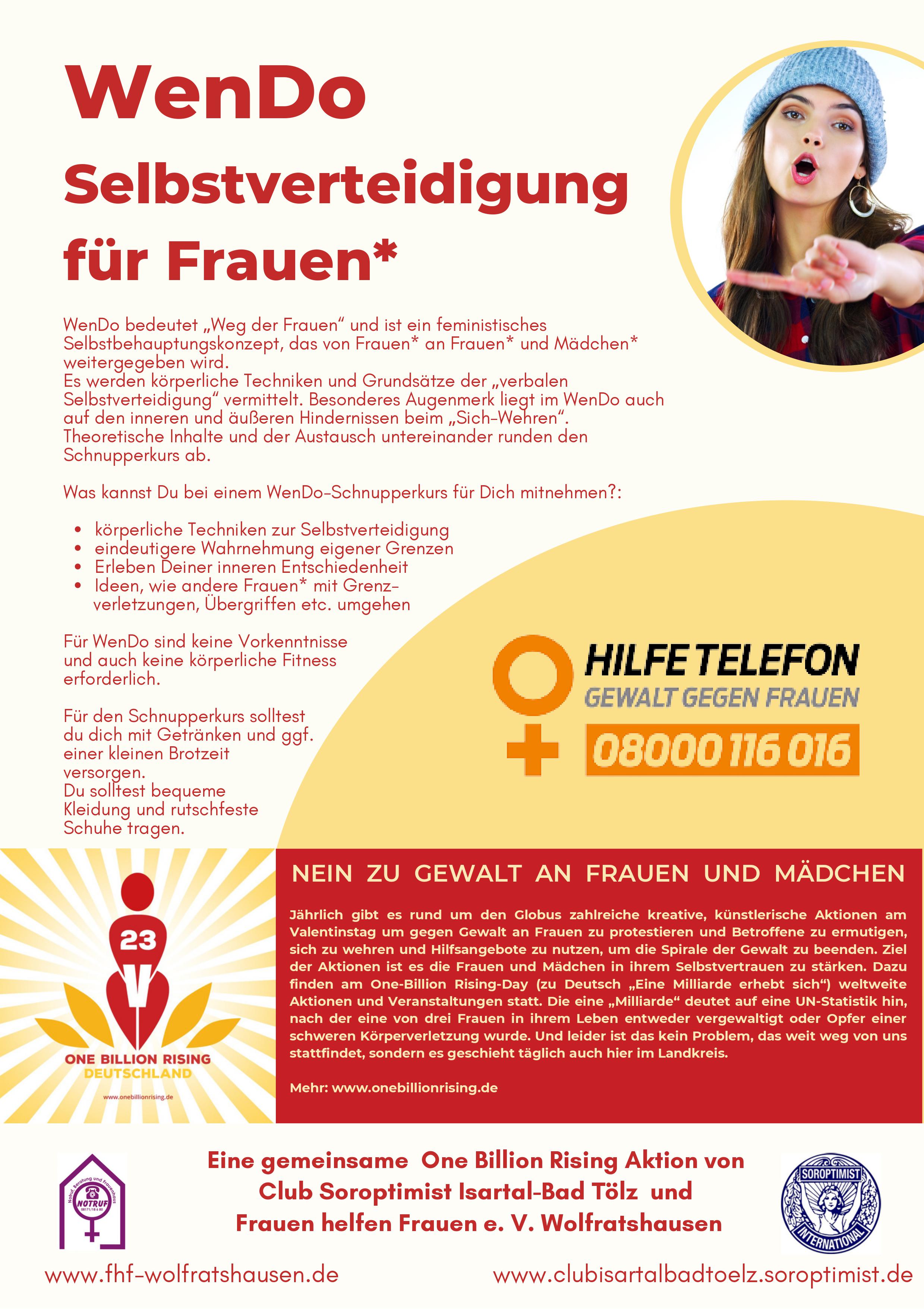 Keine Vorkenntnisse notwendig und körperliche Fitness nicht erforderlich! Kinderbetreuung bei Bedarf. Wir bitten um eine Spende in Höge von 10 € zugunsten des Frauenhauses Wolfratshausen. Eine Aktion von Club Soroptimist Isartal-Bad Tölz und Frauen helfen Frauen e.V. Wolfratshausen.