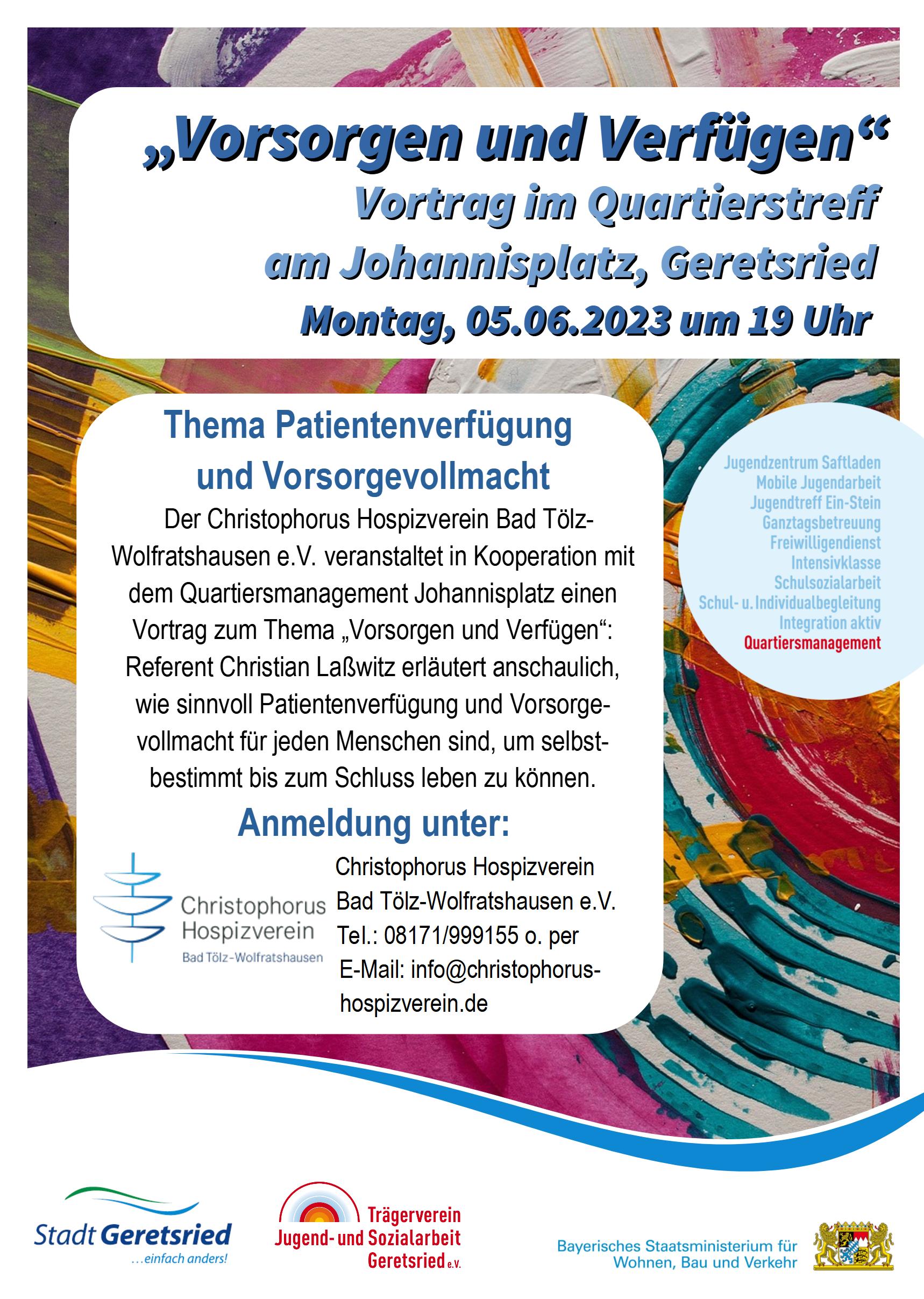 Am Montag, den 05. Juni 2023 um 19 Uhr veranstaltet der Christophorus Hospizverein Bad Tölz-Wolfratshausen e.V. in Kooperation mit dem Quartiersmanagement Johannisplatz einen Vortrag zum Thema „Vorsorgen und Verfügen“ im Quartierstreff am Johannisplatz. Referent ist Herr Christian Laßwitz, Berater für Patientenverfügung und Vorsorgevollmacht und ehrenamtlicher Hospizbegleiter für den Verein. Herr Laßwitz erläutert anschaulich anhand von Beispielen, wie sinnvoll Patientenverfügung und Vorsorgevollmacht für jeden Menschen sind, um selbstbestimmt bis zum Schluss leben zu können. Es erwartet Sie ein interessanter Vortrag.
