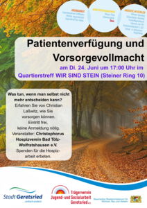 Am Dienstag, den 24. Juni 2025, um 17:00 Uhr lädt der Quartierstreff WIR SIND STEIN zu einem Vortrag über das Thema Patientenverfügung und Vorsorgevollmacht ein.Referent ist Herr Christian Laßwitz vom Christophorus Hospizverein Bad Tölz-Wolfratshausen e.V.