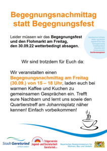 Wir müssen leider wetterbedingt das geplante Begegnungsfest und den Flohmarkt am Johannisplatz am Freitag, den 30.09.2022 absagen. Die Wetteraussichten machen unser Fest und dessen Intention leider nicht durchführbar. Wir bedanken uns bei allen Teilnehmer*innen, Dienstleister*innen und zahlreichen Flohmarktanmeldungen für eure Bereitschaft!
