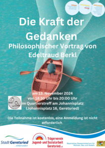 Am Mittwoch, den 13.11.2024 versammelten sich rund 33 interessierte Bürger*innen am Abend im Quartierstreff am Johannisplatz in Geretsried, um einen Vortrag von Edeltraud Berkl zum Thema „Die Kraft der Gedanken“ zu hören.