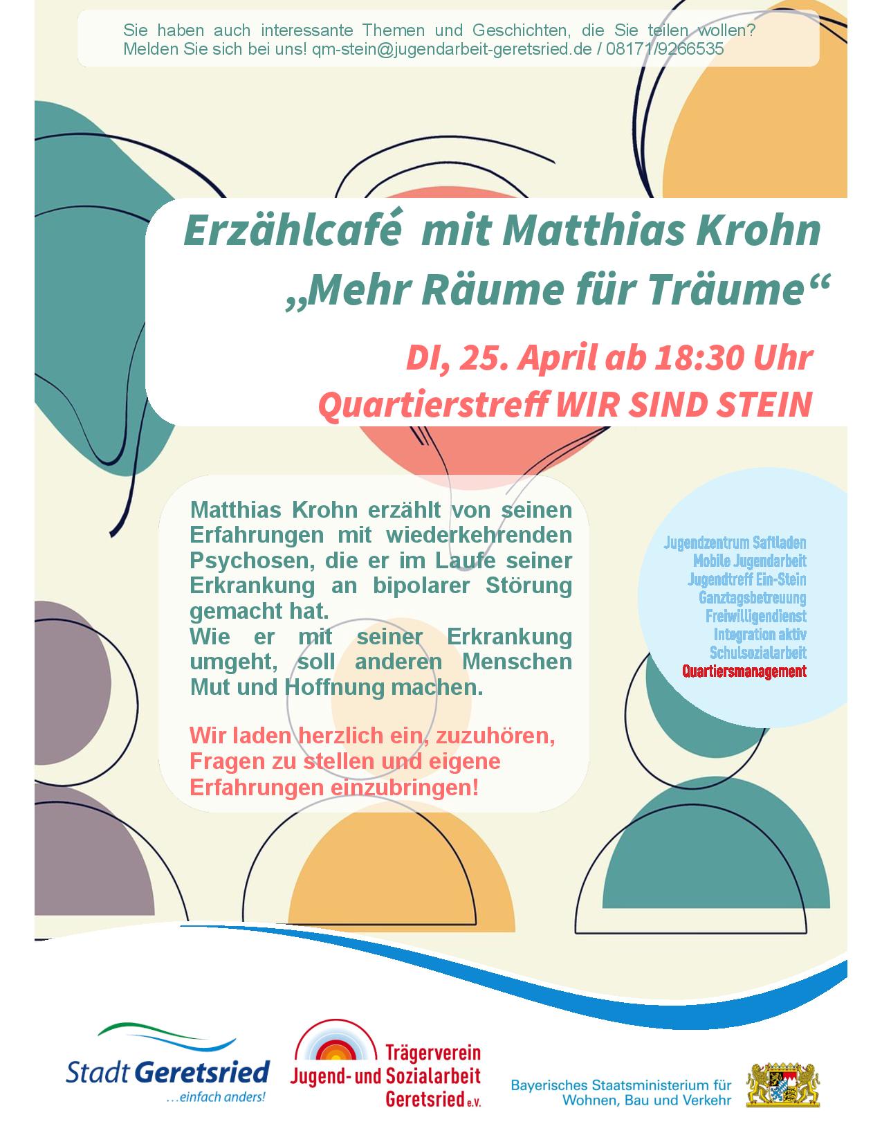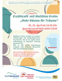 Matthias Krohn erzählte am zweiten Erzählcafé von seinen Erfahrungen mit wiederkehrenden Psychosen, die er im Laufe seiner Erkrankung gemacht hat. Wie er mit seiner Erkrankung umgeht, hat den zahlreichen Besucher*innen Mut und Hoffnung gemacht. Er stellte sein Buch „Mehr Räume für Träume“ vor und las daraus wichtige Passagen aus seinem Leben. Einen herzlichen Dank an ihn.