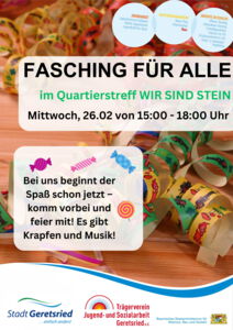 Am 26.02. um 15:00 Uhr laden wir euch herzlich zu einer fröhlichen Faschingsfeier im Quartierstreff ein. Es gibt Musik, leckere Krapfen und viel gute Laune. Wir freuen uns auf ein fröhliches Beisammensein!