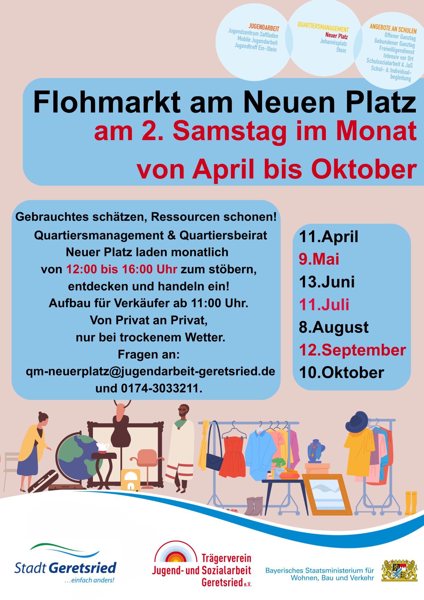 Wir bitten alle Teilnehmenden, den Platz nach der Veranstaltung sauber zu hinterlassen und nichts zurückzulassen. Der Flohmarkt findet nur bei trockenem Wetter statt. Ziel ist es außerdem, den Neuen Platz zu beleben und einen Ort der Begegnung für alle zu schaffen. Unsere ehrenamtlichen Quartiersbeiräte sind vor Ort und stehen euch bei Fragen jederzeit zur Verfügung. Bei Fragen meldet euch gerne unter qm-neuerplatz@jugendarbeit-geretsried.de oder telefonisch unter 0174 3033211.
