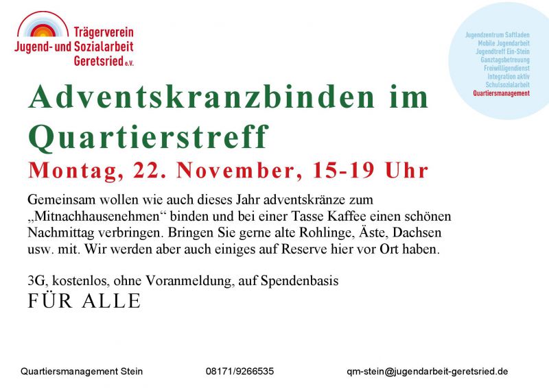 Gemeinsam wollen wie auch dieses Jahr Adventskränze zum „Mitnachhausenehmen“ binden und bei einer Tasse Kaffee einen schönen Nachmittag verbringen. Bringen Sie gerne alte Rohlinge, Äste, Dachsen usw. mit. Wir werden aber auch einiges auf Reserve hier vor Ort haben.