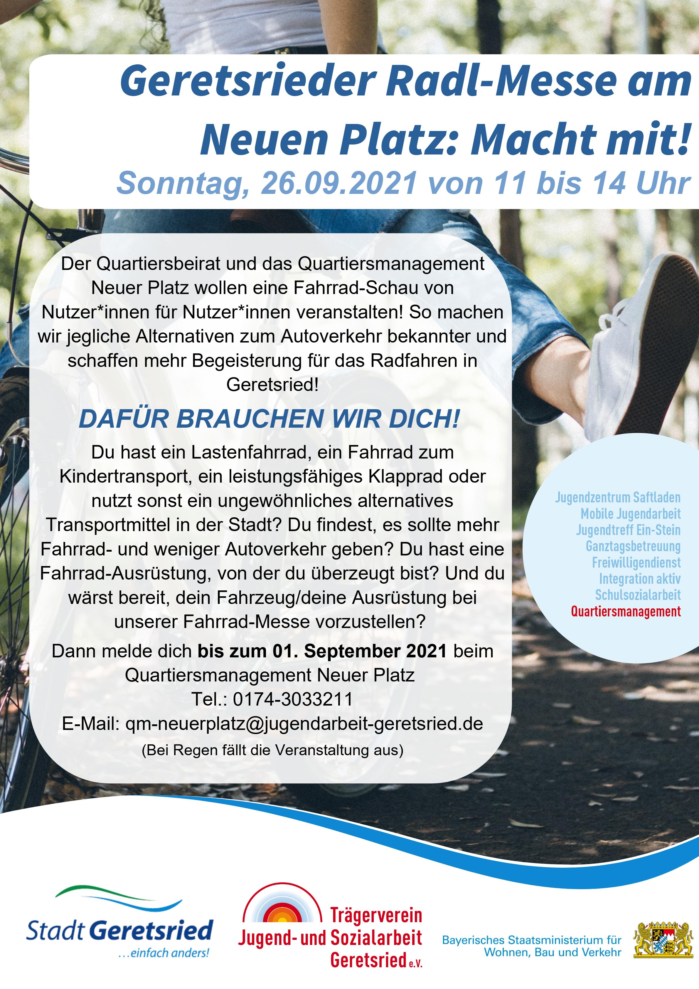 Der Quartiersbeirat plant am Sonntag, den 26.09.2021 von 11-14 Uhr eine Fahrradmesse auf dem Neuen Platz in Geretsried!
