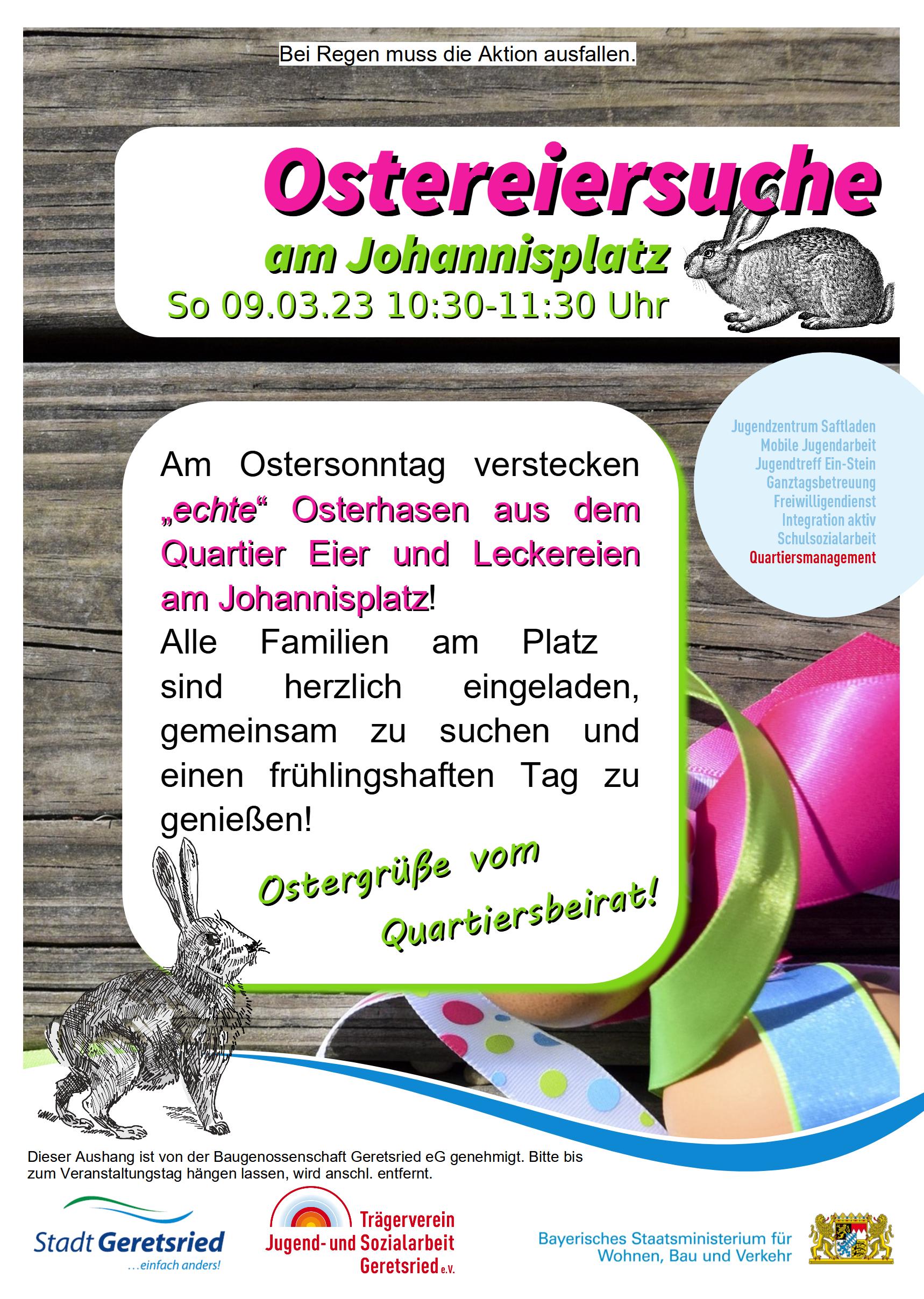Der Quartiersbeirat Johannisplatz lädt alle Familien am Platz zur gemeinsamen Ostereiersuche am Johannisplatz ein! Ab 10:30 Uhr sind viele selbst gefärbte Ostereier im Quartier versteckt, die darauf warten gefunden zu werden. Dabei kann man hin und wieder einen „echten“ Osterhasen vorbei hoppeln sehen, der das nächste Ei versteckt. Die Suche geht bis ca. 11:30 Uhr, danach verwandeln sich die Hasen wieder in Kinder! Wir freuen uns über eure Teilnahme!