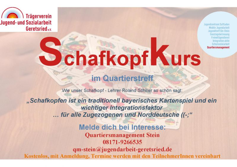 Für alle Schafkopf - Interessierten bietet Roland Schiller einen Schafkopfkurs im Quartierstreff in Stein am Steiner Ring 10 an. Wer Interesse hat an etwa 8 Treffen, um etwas reinzuschnuppern und die Grundlagen des Spiels zu erlangen, der darf sich bei uns melden: