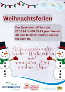 Auch wir gehen bald in die Weihnachtsferien: Der Quartierstreff am Johannisplatz ist vom 23.12.24 bis einschließlich 06.01.25 geschlossen.