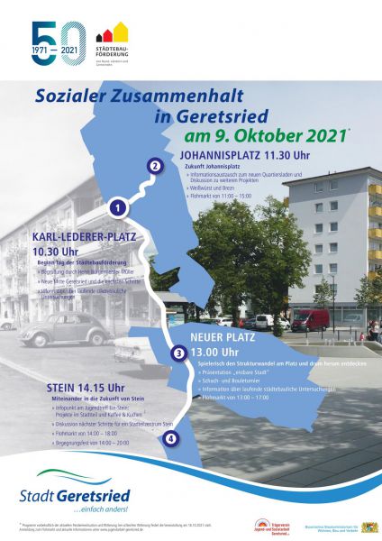 Diesen Samstag, am 09.10.2021 findet der Ausweichtermin für das Jubiläum “50 Jahre Städtebauförderung” in Geretsried statt. Die Städtebauförderung ist eine zentrale Säule der Stadtentwicklung des Bundes und unterstützt seit 1971 Städte und Gemeinden dabei, baulichen, wirtschaftlichen, gesellschaftlichen und ökologischen Herausforderungen zu begegnen.