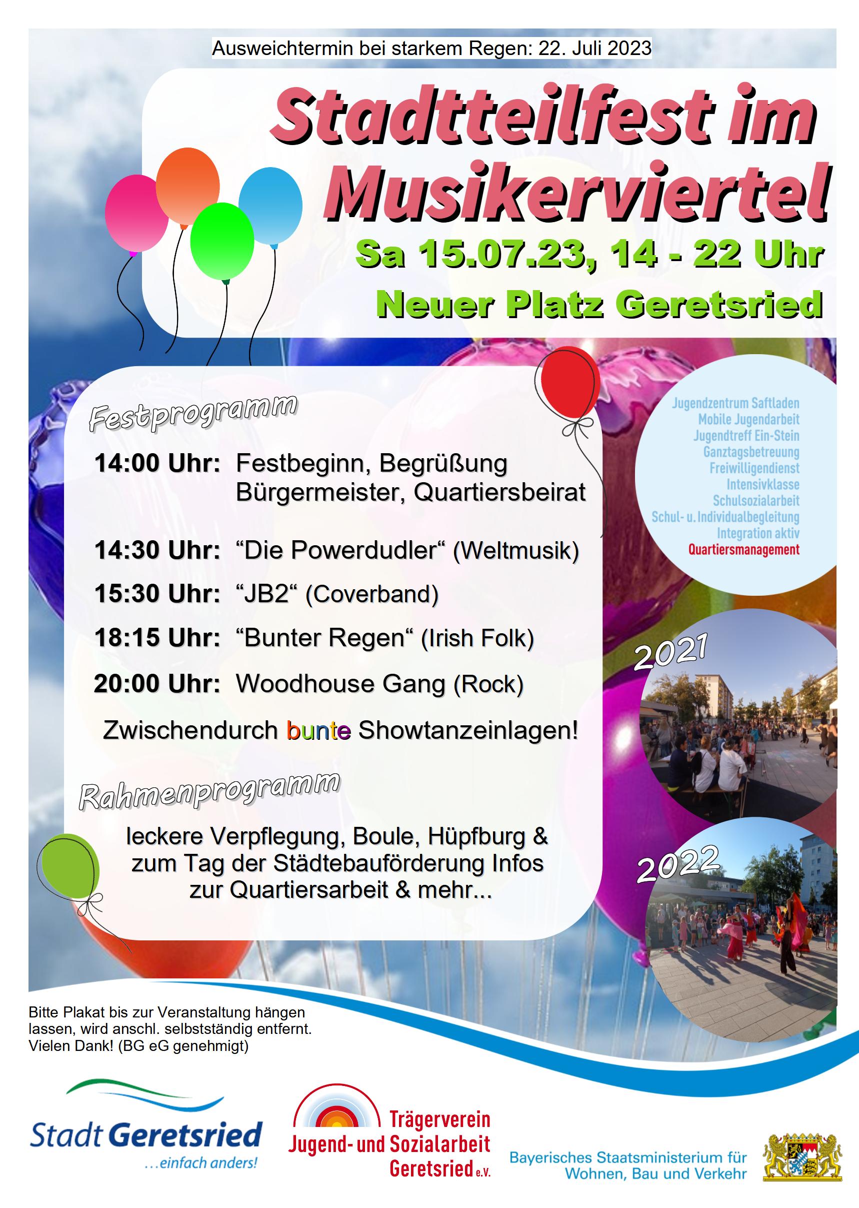Wir veranstalten unser Stadtteilfest im Musikerviertel am Neuen Platz in Geretsried! Ausweichtermin: 22.07.2023 Am Samstag, den 15.07.2023 von 14 bis 22 Uhr haben wir ein buntes Programm mit verschiedenen Künstlerinnen und Künstlern sowie tollen Showtanzeinlagen auf der Bühne: Von Irish-Folk, über Rock und Weltmusik! Außerdem gibt es leckere Verpflegung, Boule und Schachspiel, sowie zum Tag der Städtebauförderung Infos zur Quartiersarbeit! Auch ein Kinderprogramm mit Hüpfburg & Co. ist am Start. Wir freuen uns über euren Besuch, aber auch über Mithelfende zum Auf- bzw. Abbau! Bei starkem Regen weichen wir auf den Samstag, 22.07.2023 aus.