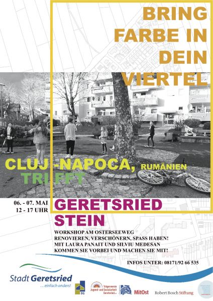 Am 6. und 7. Mai ist das Team aus Cluj-Napoca / Klausenburg (Rumänien) zu Gast. Auf Wunsch und Anregung einiger Stadtteilbewohner entstand die Idee, den Platz am Osterseeweg zu verschönern. Die Sitzgelegenheiten sollen mit Holzverkleidungen attraktiver, der Ort mit Farben, bunter und einladender, gestaltet werden. Laura Panait (Stadtanthropologin) und Silviu Medesan (Architekt) unterstützen die Stadtteilbewohner bei der Durchführung ihrer Ideen und laden alle herzlich ein, an der Aktion, die jeweils ams Samstag und Sonntag von 12:00 bis 17:00 Uhr stattfindet, teilzunehmen. Das Team freut sich über starke Hände und kreative Köpfe und alle, die Lust am Gestalten und Austausch haben.