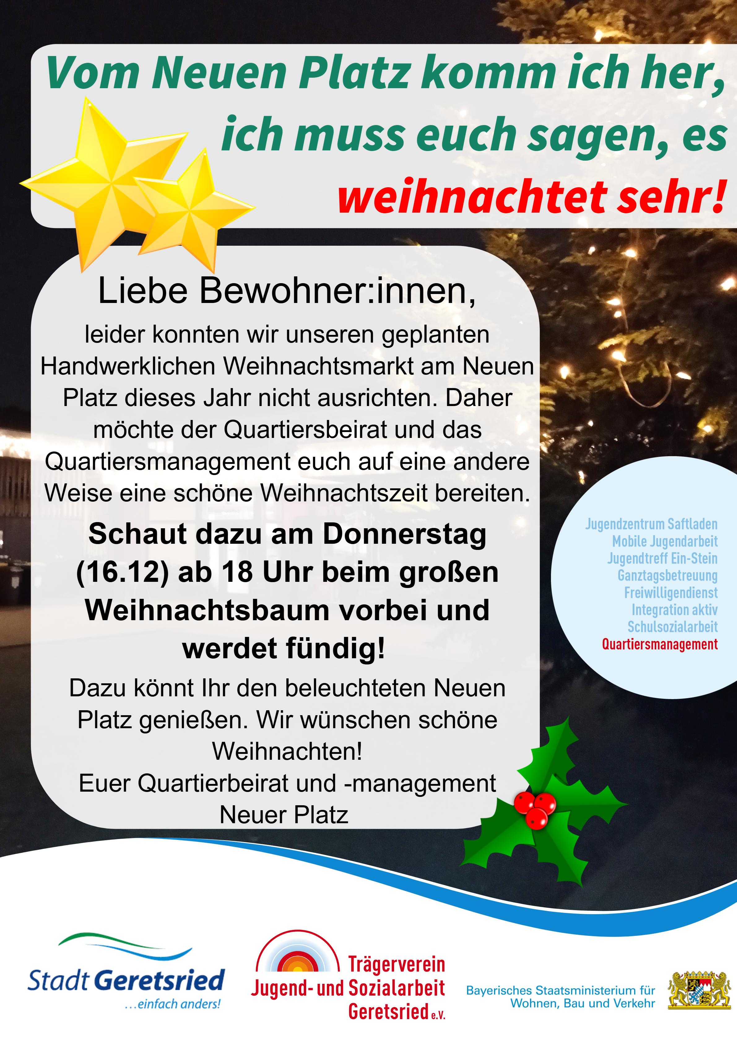 Wie auch im Plakat zu lesen, gibt es am Neuen Platz die weihnachtliche Überraschung am Donnerstag (16.12.), ab 18 Uhr am großen Weihnachtsbaum.