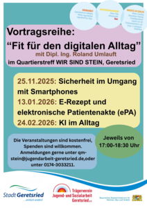 Am 13. Januar geht unsere Vortragsreihe „Fit für den digitalen Alltag“ im Quartierstreff WIR SIND STEIN in die nächste Runde. Dieses Mal dreht sich alles um das E-Rezept und die elektronische Patientenakte (ePA). Herr Umlauft erklärt die Inhalte anschaulich und leicht verständlich und präsentiert praktische Apps zu beiden Themen.