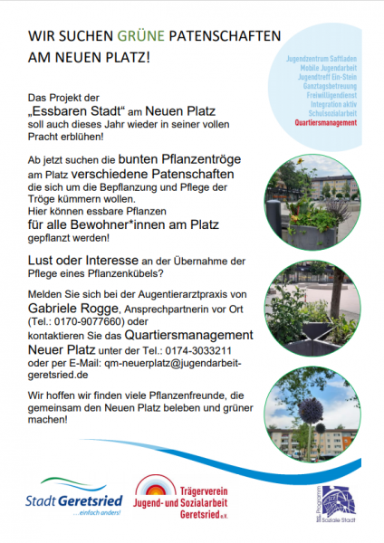 Werkzeug, Gießkannen und Wasser gibt es vor Ort, sodass direkt losgelegt werden kann. Interessierte an der Übernahme der Pflege eines Pflanzenkübels können sich entweder bei der Augentierarztpraxis von Gabriele Rogge, Ansprechpartnerin vor Ort (Tel.: 0170-9077660) melden oder das Quartiersmanagement Neuer Platz unter der Tel.: 0174-3033211 oder per E-Mail: qm-neuerplatz@jugendarbeit-geretsried.de kontaktieren.