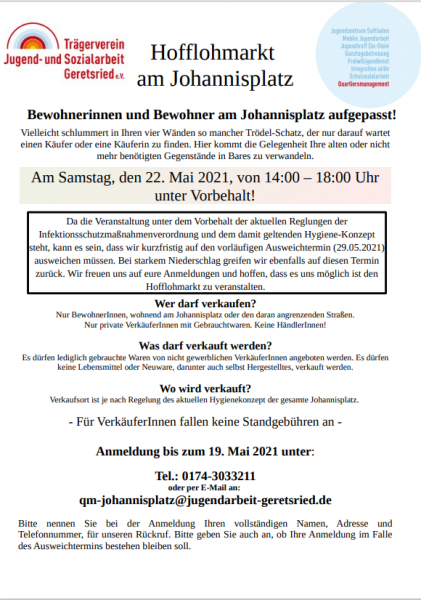 Deshalb sammeln wir ab jetzt bis zum 19.05.2021 eure Anmeldungen für einen Verkaufsstand am Johannisplatz, es gibt keine Standgebühren! Anmelden dürfen sich für den Hofflohmarkt BewohnerInnen des Johannisplatz und alle der daran angrenzenden Straßen. Bitte nennen Sie bei der Anmeldung Ihren vollständigen Namen, Adresse und Telefonnummer, unter welcher Sie für einen Rückruf zu erreichen sind. Bitte geben Sie auch an, ob Ihre Anmeldung im Falle des Ausweichtermins bestehen bleiben soll.