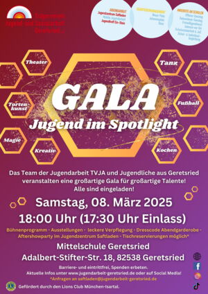 Das Team Jugendarbeit im Trägerverein Jugend- und Sozialarbeit Geretsried e.V. und Besucher*innen unserer beiden Jugendhäuser veranstalten die „Gala der Talente – Jugend im Spotlight“ am 08. März 2025 in die Mittelschule Geretsried (Adalbert-Stifter-Str. 18) ein. Wir wollen zeigen, was Kinder und Jugendliche aus Geretsried interessiert, begeistert und stark macht!