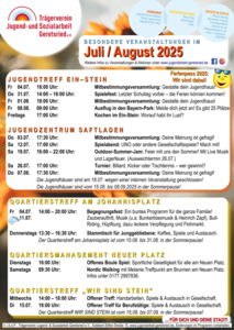 Weitere Angebote findet ihr auf unserem Plakat. Bitte beachtet auch, dass unsere Einrichtungen am 18.07. nachmittags wegen einer internen Veranstaltung geschlossen sind und ab dem 15.08.2025 in Sommerpause gehen.