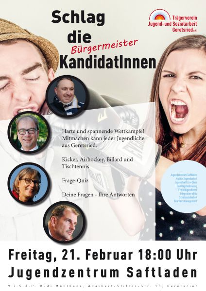 Ein spannender und unterhaltsamer Standfestigkeitstest steht dem Quartett um die Wahl zur Bürgermeisterin / zum Bürgermeister am Freitag den 21. Februar bevor. Wir laden alle Erstwähler*innen und Teilnehmer*innen der Jugendkommunalwahl herzlich zum Schlagabtausch mit Michael Müller, Martina Raschke, Larry Terwey und Wolfgang Werner in den Saftladen ein!