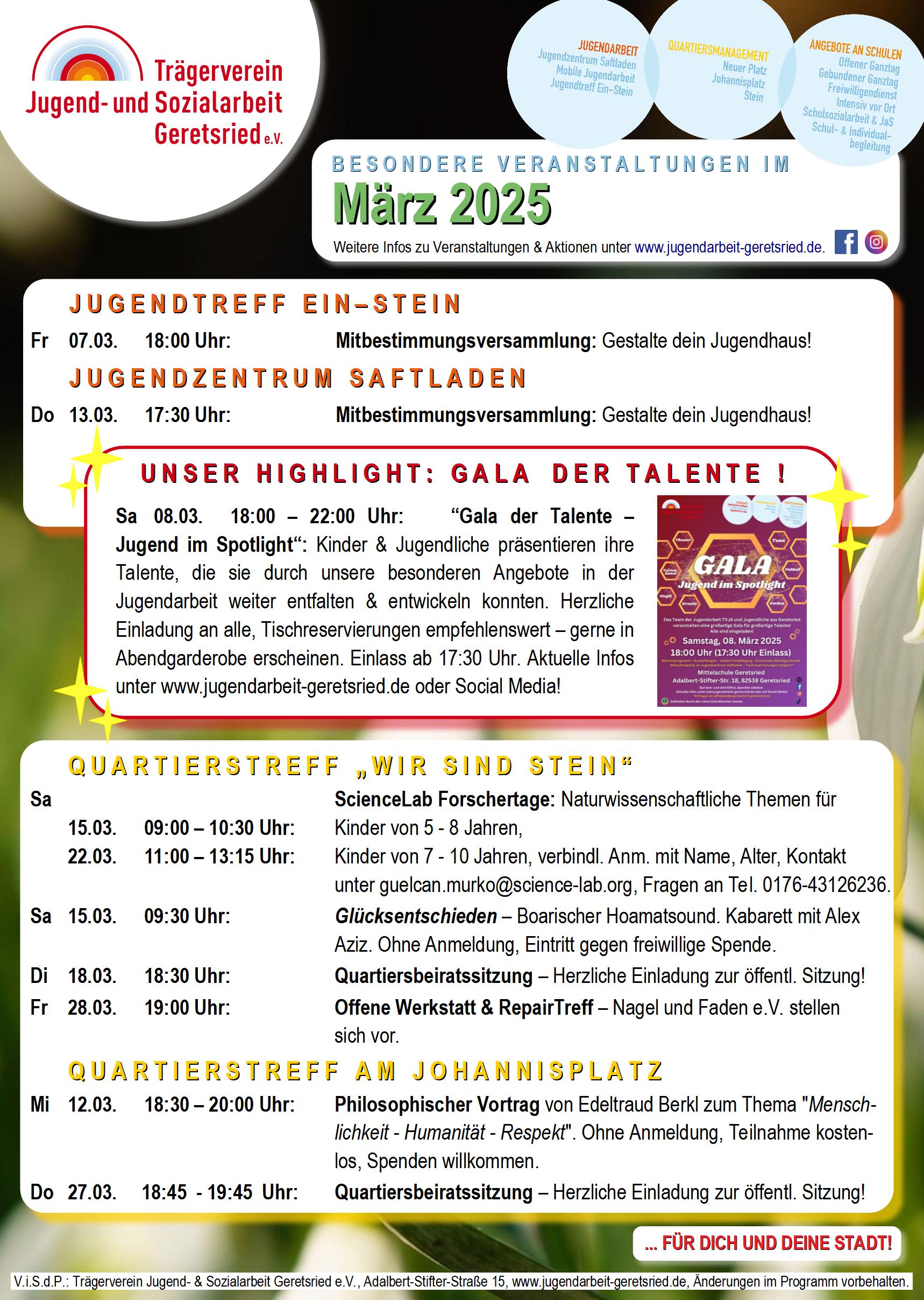 Unsere besonderen Veranstaltungen im Monat März 2025! Wir freuen uns auf tollen Input in den Quartieren und auf die Gala der Talente - Jugend im Spotlight in der Jugendarbeit!