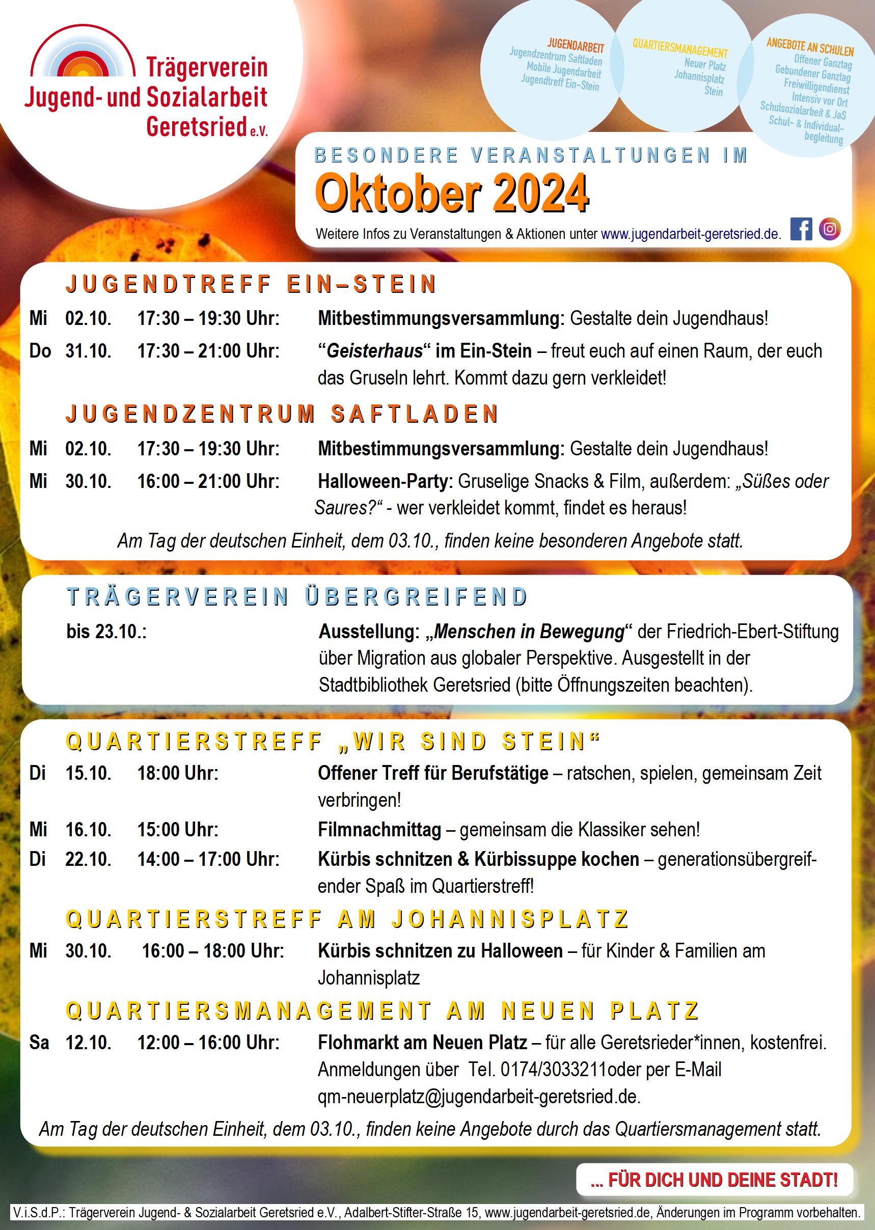 Freut euch mit dem Verfärben der Blätter auf tolle Herbst-Veranstaltungen beim TVJA! Flohmarkt am Neuen Platz, Ausstellung in der Stadtbibliothek, Kürbis schnitzen und Halloween-Partys! Perfekte Einstimmung in die bunte Jahreszeit...
