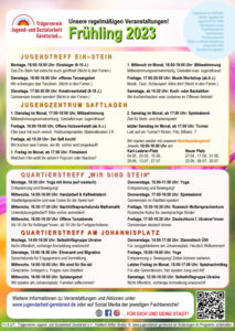 Das Frühlingsprogramm des TVJAs: Hier erhaltet Ihr einen guten Überblick über unsere ganzen regelmäßigen Aktionen und Angebote in unseren Einrichtungen und Fachbereichen! Um weitere Infos und Veranstaltungen nicht zu verpassen, folgt uns und unseren Fachbereichen auf Social Media!
