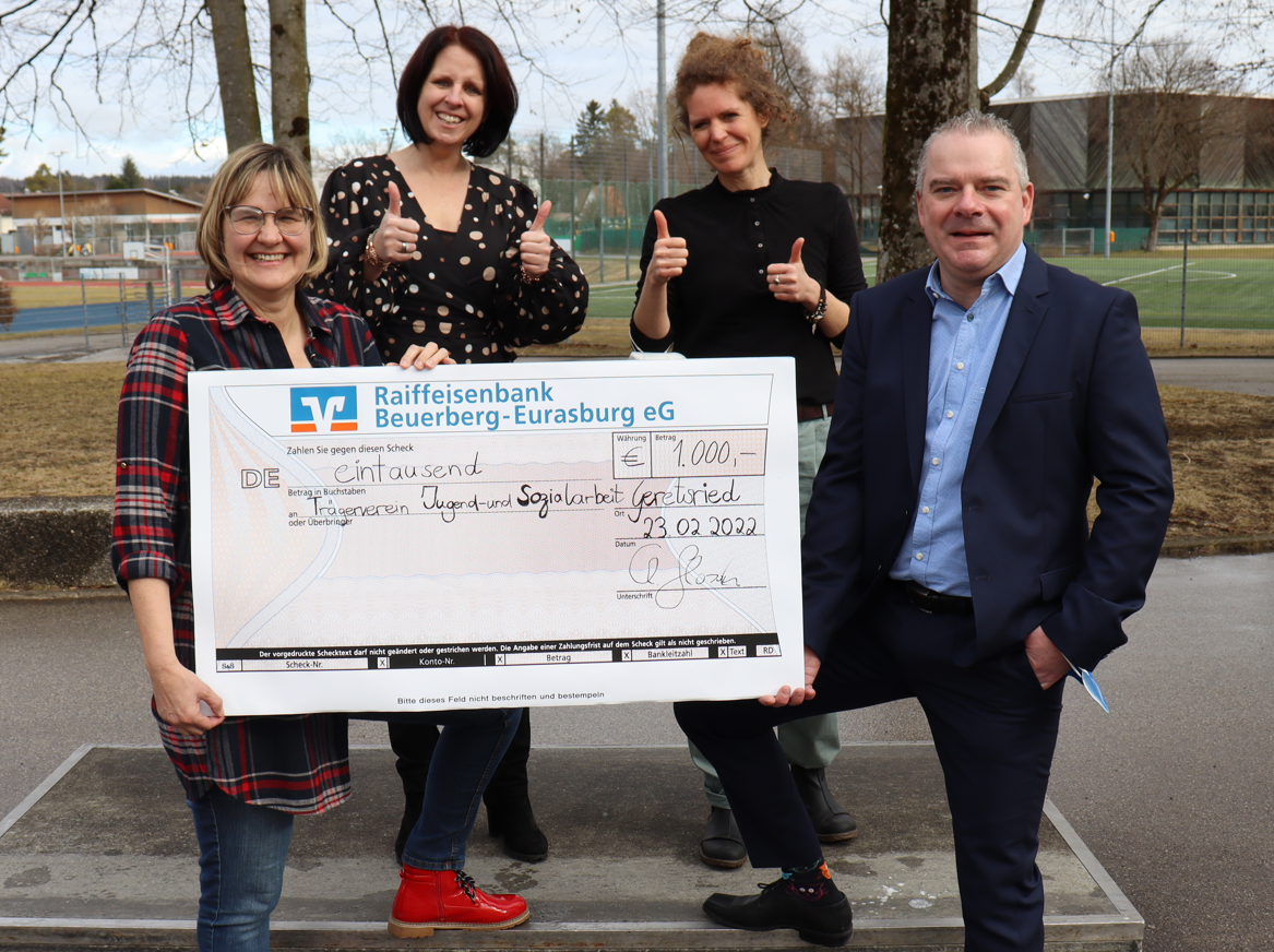 ... den Vertreter*innen der Raiffeisenbank Beuerberg-Eurasburg eG und allen Mitarbeitenden. Frau Lea und Herr Glasauer überreichten kürzlich einen symbolischen Scheck in Höhe von 1.000 Euro an den TVJA.