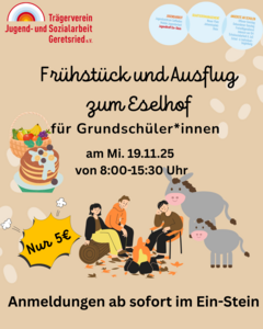 ...Zuerst gibt es ein gemeinsames Frühstück, dann fahren wir mit dem Bus in die Rothmühle bei Königsdorf um dort einen Tag mit den Esel im Natur- und Erlebnishof zu verbringen. Es wird auch ein Lagerfeuer geben. Anmeldung im Ein-Stein.