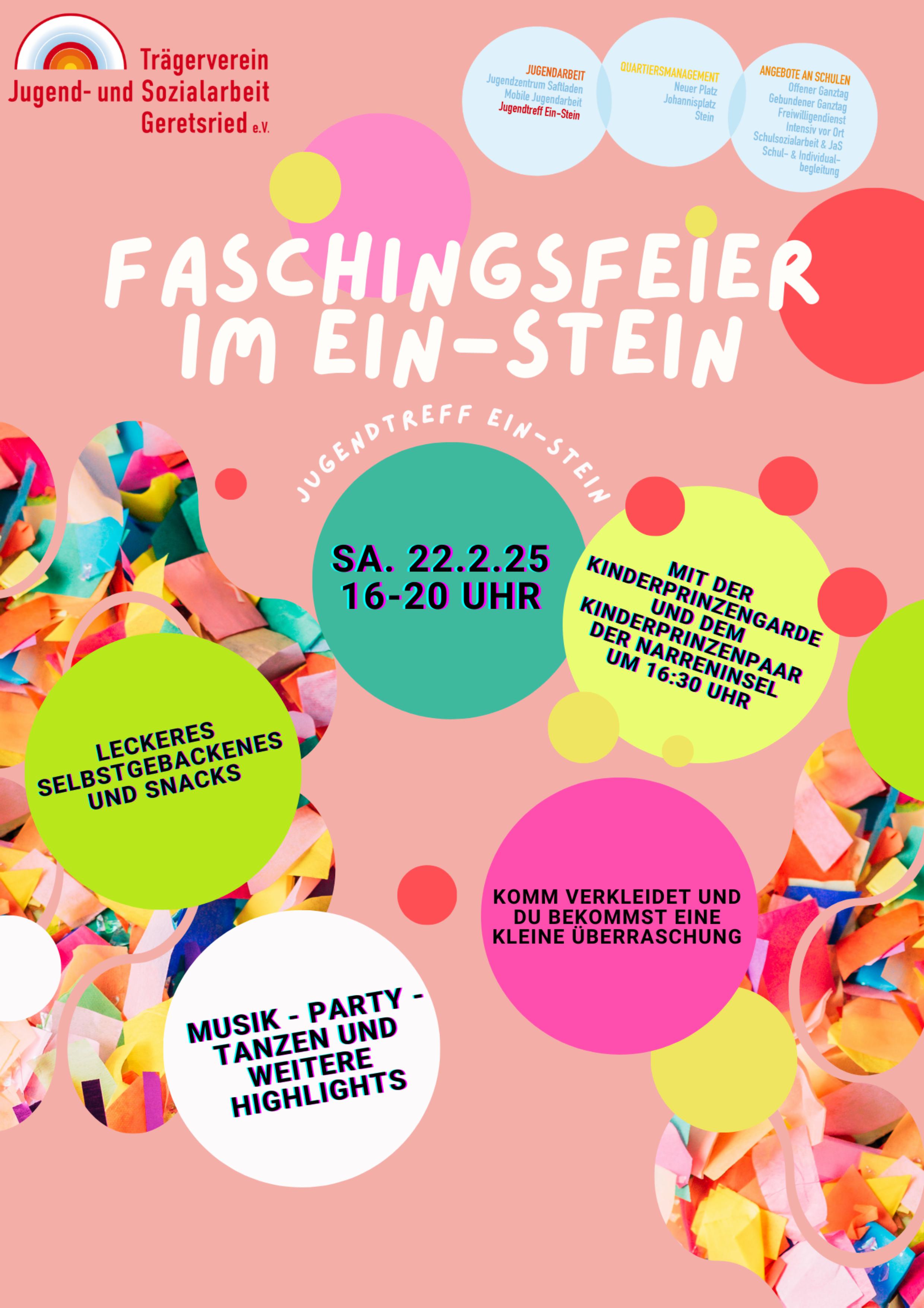 Am Samstag, den 22. Februar wird es so richtig bunt im Jugendtreff Ein-Stein! Freut euch auf eine lustige Faschingsfeier mit Musik, Tanz, Kostümen und auf ein besondere Highlight: Die Kinderprinzengarde und das Kinderprinzenpaar der Narreninsel! Die besuchen uns nämlich im Ein-Stein, um mit euch allen Fasching zu feiern! Ab 16:00 Uhr gehts los!