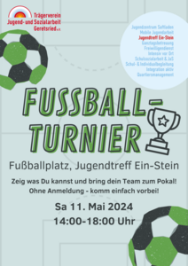 Der Jugentreff Ein-Stein veranstaltet am Samstag, den 11. Mai ein Fußballturnier! Ab 14:00 Uhr geht´s los. Kommt einfach vorbei.