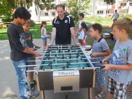 Die MitatbeiterInnen des Jugendtreffs kündigten die Profis im Vorfeld an – doch so richtig glauben konnten die Besucher diesen hohen Besuch tatsächlich erst in dem Moment, als Thomas Riem selbst zum Tischkicker trat und den Ball mit nur einer geschickten Bewegung im Tor versank.