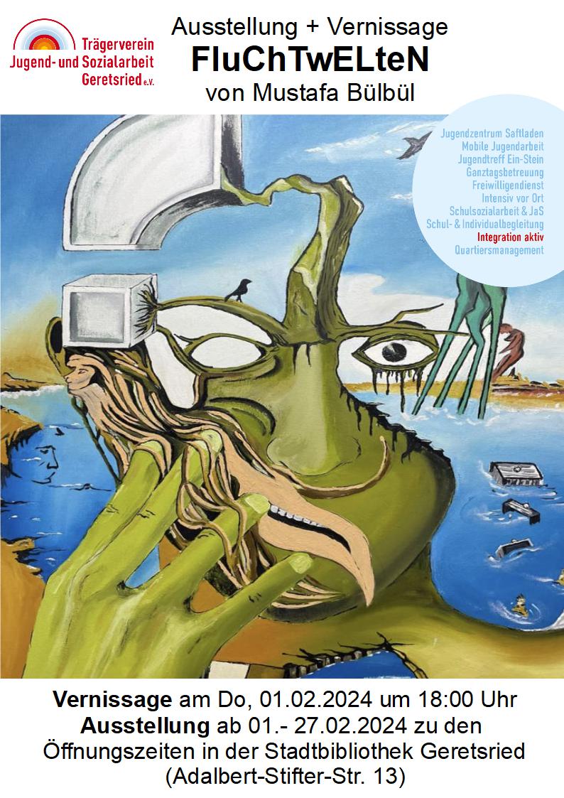 Mustafa Bülbül und seine Frau haben ihre Heimat Türkei aufgrund einer lebensbedrohlichen Situation verlassen und sind nach einer schwierigen und gefährlichen Flucht im Mai 2023 in Freiburg angekommen. Nach einiger Zeit konnte der Künstler in Garmisch-Partenkirchen seiner Leidenschaft, dem Malen, wieder nachgehen. In seinen Gemälden, die von einem surrealistischen und kubischen Stil geprägt sind, stellt er seine Erlebnisse auf der Flucht dar und veranschaulicht, welche Spuren diese emotional und psychisch bei ihm hinterlässt. Gleichzeitig möchte der Künstler mit der Ausstellung erklären und spüren lassen, dass die Flucht, trotz aller schwierigen und herausfordernden Begleitumstände, ein neues Leben, und vor allem Hoffnung, für ihn und seine Familie bedeutet.