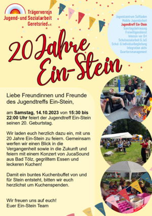 Der Jugendtreff Ein-Stein feiert 20 Jähriges Bestehen – nichts hält bekanntlich länger als ein Provisorium. Am Samstag, den 14.10.2023 von 15:30 – 22:00 Uhr feiert der Jugendtreff Ein-Stein sein 20-Jähriges Jubiläum. Wir laden alle Besucher*innen, ehemalige Besucher*innen und Freund*innen des Ein-Steins ein, gemeinsam mit uns 20 Jahre lebendigen Jugendtreff zu feiern.