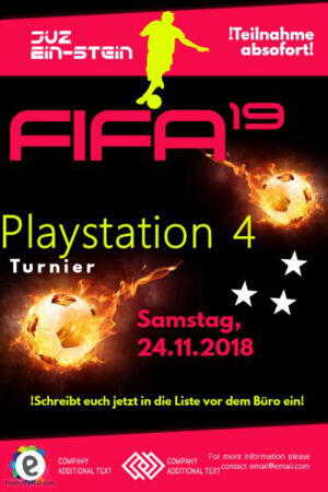 Am Montag, den 24.11.18 findet im Jugendtreff Ein-Stein ein Playstation 4 FIFA 19 Turnier im X-Raum statt. Wenn ihr Lust habt mitzumachen, dann schreibt euch in die Liste vor dem Büro ein. Der Gewinner bekommt einen 15 Euro-Gutschein von Pizza Primo.