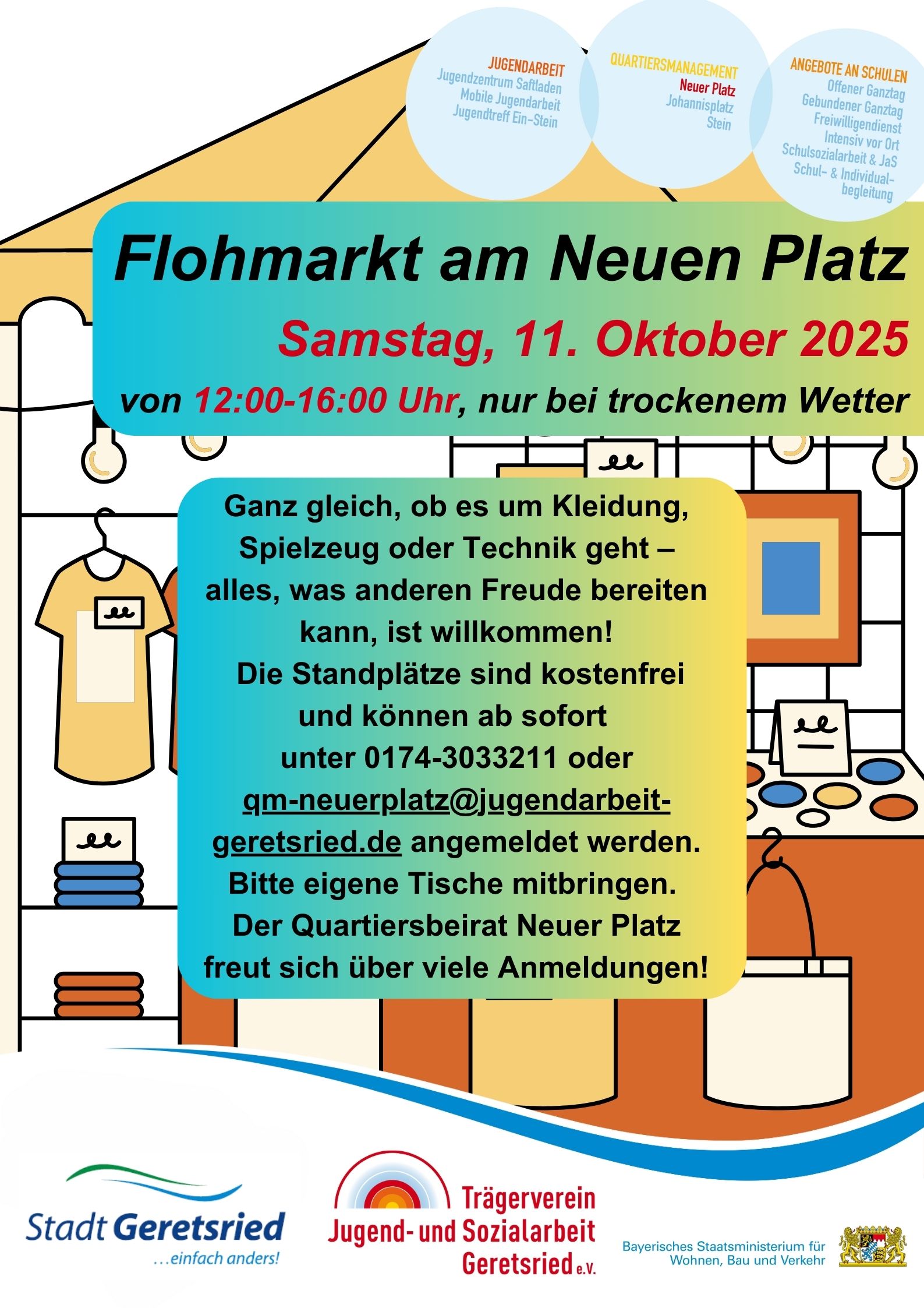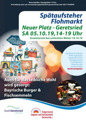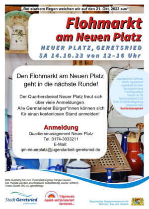 Die Standplätze sind für alle Geretsriederinnen und Geretsrieder kostenfrei und können ab sofort beim Quartiersmanagement Neuer Platz unter Tel. 0174-3033211 oder E-Mail: qm-neuerplatz@jugendarbeit-geretsried.de angemeldet werden. Bitte eigene Tische mitbringen. Bei nassem Wetter findet der Flohmarkt nicht statt!